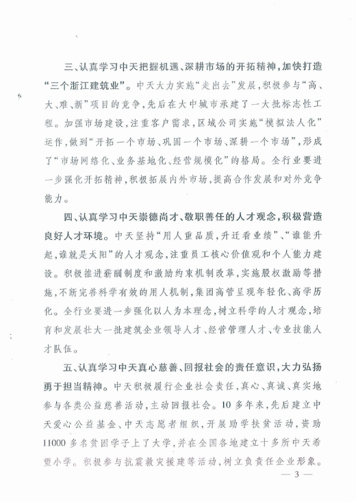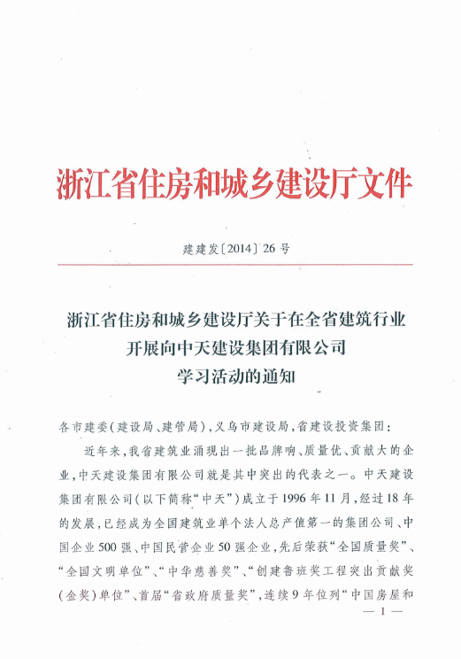 《浙江省住房和城乡建设厅关于在全省建筑行业开展向天九娱乐建设集团有限公司学习活动的通知》